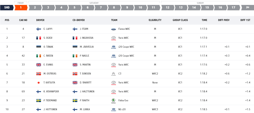 Empatando sus respectivas marcas a la décima, Lappi-Ferm y Ogier-Ingrassia comparten la batuta de mando del Rally de Estonia en sus compases iniciales. Tanto los de M-Sport Ford como los de Toyota Gazoo Racing completaron la cronometrada inaugural en 1:17.0, superando ambos en apenas una décima a los héroes locales Tänak-Järveoja.