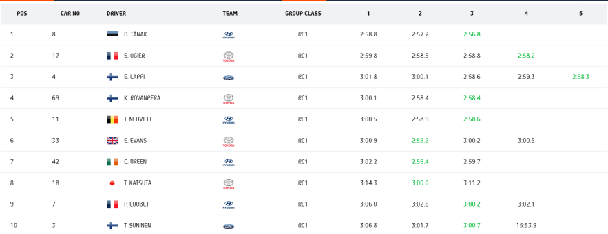 Cuartos y también a una décima de sus compatriotas se situaron Rovanperä-Halttunen, cerrando el top cinco dos décimas por detrás los belgas Neuville-Gilsoul. Sextos finalizaron Evans-Martin recuperando la confianza con el vehículo nipón después de su accidente en el Louna-Eesti Rally hace dos semanas.