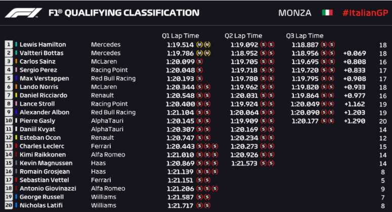 En la Q1 se formó una melé habitual en Monza en busca de rebufos. De ella el más perjudicado fue Sebastian Vettel, que mientras preparaba su asalto definitivo era adelantado en la Parabólica por George Russell. Ambos caerían eliminados y sin posibilidad de mejorar sus registros previos. El alemán saldrá en P17, justo por detrás de Romain Grosjean. Las plazas del fondo de la parrilla son posesión de Antonio Giovinazzi, el propio Russell y Nicholas Latifi.