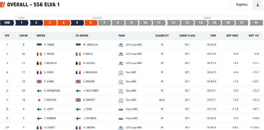 Los irlandeses completaron un excelente bucle posicionándose justo por delante de la otra dupla titular de Hyundai Motorsport. Neuville-Gilsoul acortaban distancias tramo a tramo con los Toyota dirigidos por Ogier-Ingrassia y Evans-Martin, consiguiendo superar a ambos en el TC-4 y conformando de paso el triplete provisional para la formación de Andrea Adamo.