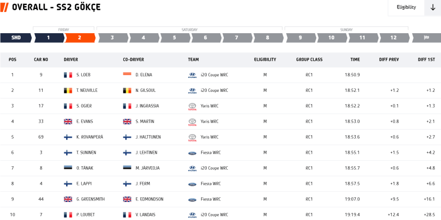 Además, ascendieron a un liderato que ocupaban tras el TC-1 sus compañeros de equipo Neuville-Gilsoul en un tramo con zonas en las que la visibilidad era nula debido al polvo en suspensión, incidencia que relegó a Tänak-Järveoja del tercer puesto al séptimo. Monumental el cabreo tanto del piloto belga como del estonio al arribar al Control Stop del TC-2 con los organizadores, intensificado por el valor de la tabla de tiempos en este viernes extraordinario.