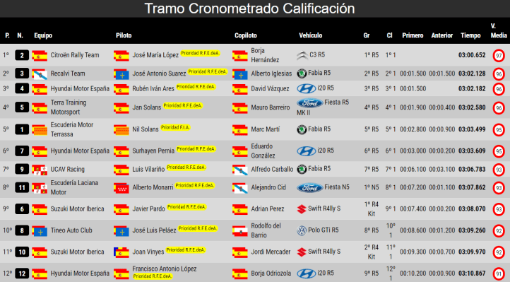 A pesar de ese cambio meteorológico, la cronometrada de Castell de Guadalest y sus 4.87 kilómetros amanecían húmedos desde la salida hasta la mismísima meta. Sin embargo, a medida que pasaban las horas el piso procedió a secarse por completo antes del importante Tramo de Clasificación, en el que se decide el orden de partida de los prioritarios. Los primeros en elegir su posición de largada sabatina serán los defensores de ambos títulos, Pepe López-Borja Rozada, que, después de liderar los tiempos en el Shakedown previo, también se anotaron el scratch en el TCC al volante del Citroën C3 R5.