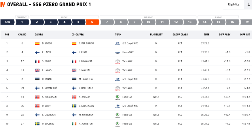 Copiando todos la estrategia de Lappi-Ferm, los contendientes a la corona comenzaron a recuperar tiempo al dúo de cabeza. Con las carreteras de la etapa sabatina luciendo un grueso manto blanco, los precursores de la táctica óptima reservaron sus ruedas para mañana y disputaron el nocturno ‘Grand Prix 1’ con zapatos de lluvia, cediendo de esta forma el liderato a Sordo-Del Barrio por apenas un segundo. Las tres posiciones siguientes las ocupan los duetos que batallan por la codiciada corona, encabezando el grupo Ogier-Ingrassia. Sus compañeros de equipo Evans-Martin figuran en P4 con una renta de seis décimas sobre Tänak-Järveoja. La igualdad entre los participantes de la categoría reina la completan Rovanperä-Halttunen, sextos a 24.8» de la primera plaza.