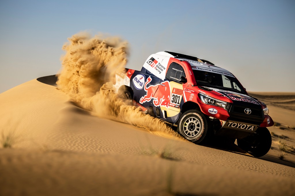 Los Toyota Hilux dominaron contundentemente y sin ningún síntoma de temor a abrir pista en los 277 kilómetros de la cronometrada de apertura. Entre los 4×4 de la firma nipona destacó la dupla formada por Nasser Al Attiyah-Matthieu Baumel, los hombres sobre los que la formación oficial fija sus esperanzas para añadir un triunfo más a sus vitrinas. Caracterizado por su velocidad explosiva, el piloto catarí endosó 8″ al héroe local, Yazeed Al Rajhi, que acompañado por Dirk von Zitzewitz tratará de encontrar la constancia que le privó de alegrías mayores en el debut de la prueba en sus tierras el pasado año. Sin embargo, la sorpresa del día la protagonizaron Brian Baragwanath-Taye Perry, segundos con el competitivo Century CR6 tras empatar con la tripulación #301 y partir a la prólogo en un retrasado trigésimo octavo puesto.
