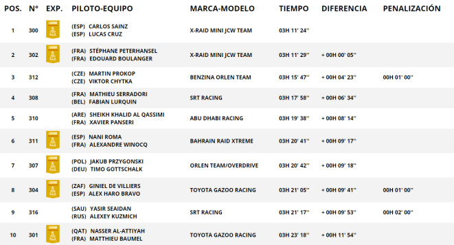 El regreso de Sébastien Loeb-Daniel Elena a la prueba reina en lo que a resistencia se refiere se saldó con una losa de 24:14 con respecto a Sainz-Cruz. Los nueve veces campeones del mundo de rallyes sufrieron varios pinchazos en el debut oficial del Hunter BRX construido por Prodrive. Nani Roma-Alexandre Winocq, por su parte, terminaron sextos a 9:34 de la tripulación #300. Justo a sus espaldas encontramos al Toyota Hilux más rápido, el dirigido por Jakub Przygonski-Timo Gottschalk, que perdieron 09:46. Una penalización por exceder la velocidad permitida arrebató ese privilegio a Giniel de Villiers-Álex Haro, octavos y precediendo a los también sancionados Yasir Seaidan-Alexey Kuzmich (Century CR6).