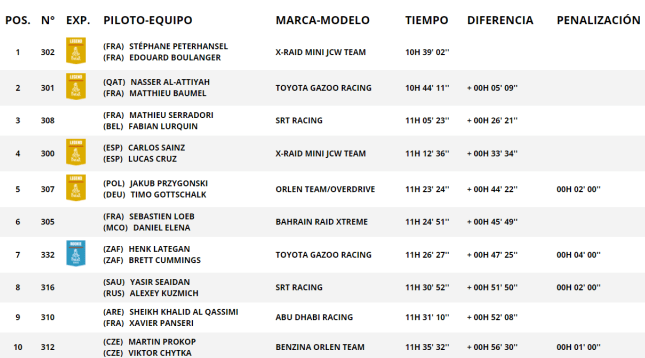 El equipo SRT Racing prosigue con su tendencia positiva gracias a las actuaciones de Mathieu Serradori-Fabian Lurquin y Yasir Seaidan-Alexey Kuzmich. Los desarrolladores del Century CR6 recogen la medalla de bronce provisional tras el error de Sainz-Cruz, mientras la promesa árabe concluyó la etapa en el cuarto puesto y regresa al top 10 en detrimento de Nani Roma-Alexandre Wincocq (Hunter BRX), Brian Baragwanath-Taye Perry (Century CR6) y los anteriormente mencionados Al Rajhi-von Zitzewitz.