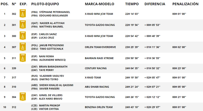 La dupla española logró un resultado balsámico con el que recuperan la moral pérdida en las últimas jornadas tras los reiterativos problemas con la navegación que les han dificultado la reválida del triunfo que obtuvieron en Arabia Saudí el pasado año. A pesar de los contratiempos, Carlos Sainz-Lucas Cruz no se dan por vencidos y reducen a 40:39 la diferencia que les separa de los líderes, honor que por quinto día consecutivo pertenece a sus compañeros de equipo Stéphane Peterhansel-Edouard Boulanger.