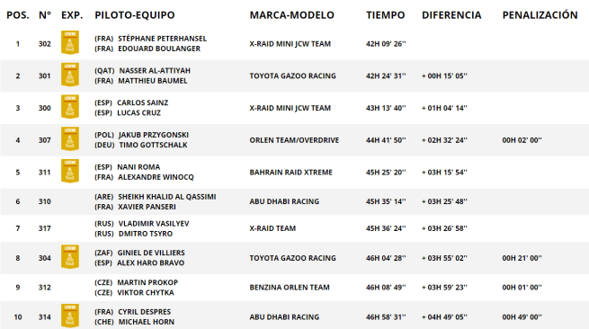 En el octavo puesto, Giniel de Villiers-Álex Haro se defienden con su Toyota Hilux oficial de los checos Martin Prokop-Viktor Chytka (Ford Raptor RS Cross Country), que les persiguen a 4:21. El top diez lo cierran Cyril Despres-Mike Horn, autores de una magnífica segunda semana a los mandos de un Peugeot 3008 DKR similar al que empleó el cinco veces ganador en la categoría de motos en su debut con los coches.