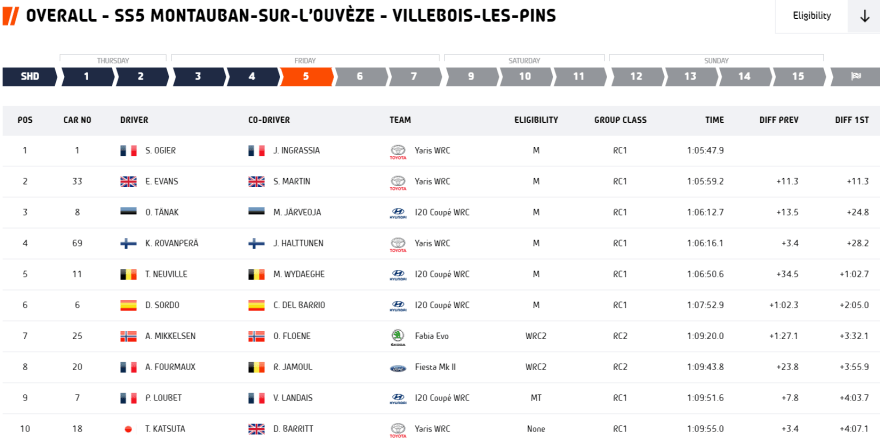 Con el Toyota Yaris WRC #1 y su pedal de freno a pleno rendimiento, los defensores del título imprimieron un ritmo inalcanzable para sus rivales en las secciones con humedades y hielo, anotándose las tres victorias parciales de la mañana y aprovechando la penalización de 10» impuesta a sus compañeros de equipo Kalle Rovanperä-Jonne Halttunen. Los finlandeses confirmaron de nuevo su potencial en el asfalto francés, pero su retraso al arribar al cuarto control horario más la suciedad con la que se encontraron en el TC-5 lastraron su progreso, situándose cuartos a 28.2» de la dupla francesa.