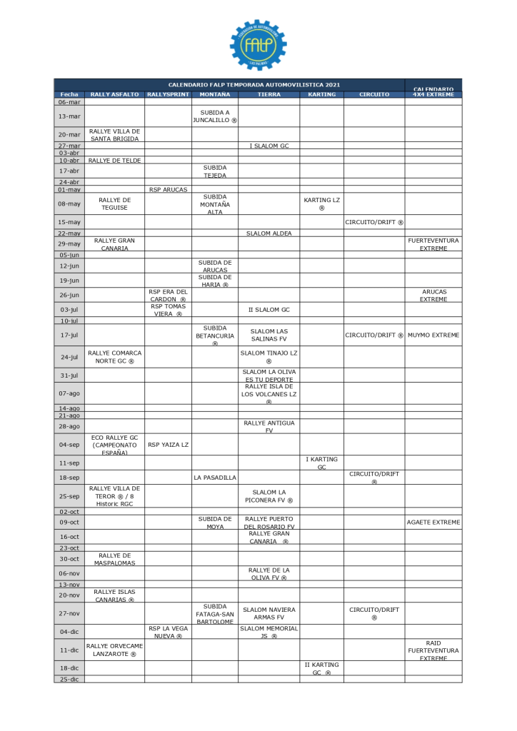 Con el arranque de la nueva temporada a la vuelta de la esquina, la Federación de Automovilismo de Las Palmas ha publicado el calendario de la campaña 2021. Compuesto por una medio centenar de pruebas, el organismo regidor del deporte del motor en la provincia oriental tratará de reinstaurar la normalidad a la competición en las islas de Gran Canaria, Fuerteventura y Lanzarote después de un atípico curso como el que finalizo el pasado año en el municipio de San Bartolomé de Tirajana.