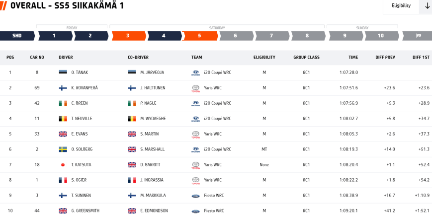 Lejos de disminuir la confianza de Tänak-Järveoja al volante del artefacto surcoreano, estos se recompusieron con la cuarta victoria parcial de cinco posibles en la tercera y última cronometrada de la primera sección de la jornada, aumentando así su renta a los 23.6» sobre los locales Kalle Rovanperä-Jonne Halttunen. A pesar de carecer de la confianza suficiente en el habitáculo del Toyota Yaris WRC #69 tras una ligera modificación de reglajes, los finlandeses voladores lograron rebasar en la clasificación general al Hyundai dirigido por Craig Breen-Paul Nagle. Los irlandeses, actualmente terceros, ruedan a 5.3» de sus predecesores y con dos duplas más que intentan inmiscuirse en la lucha por el podio a sus espaldas.