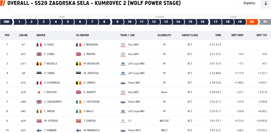 Sin embargo, el primer golpe de la jornada lo recibían Sébastien Ogier-Julien Ingrassia, y precisamente no fue asestado por ninguno de sus rivales en la batalla por el triunfo. En el enlace hacia el TC-16, los galos sufrieron un percance en forma de accidente que dañó considerablemente la parte derecha del Toyota Yaris WRC, tanto que el copiloto heptacampeón se vio obligado a emplear gafas de esquí debido a que resultaba imposible cerrar su puerta por completo. Desconcentrados por el percance, sus compañeros Elfyn Evans-Scott Martin les desbancaban de lo más alto de la tabla en el antepenúltimo tramo. Además, Thierry Neuville-Martijn Wydaghe acortaban distancias peligrosamente con su Hyundai i20 Coupé WRC.