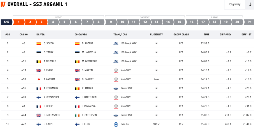 La pareja española lidera la cuarta ronda del Campeonato del Mundo de Rallyes al término de las tres especiales del bucle matinal. A pesar de ser estas las primeras que realizan juntos dentro del habitáculo del Hyundai i20 Coupé WRC, Daniel Sordo-Borja Rozada se anotaron dos scratchs que les permiten comandar la clasificación por 6.7″ sobre sus compañeros de equipo Ott Tänak-Martin Järveoja. Los belgas Thierry Neuville-Martijn Wydaeghe ocupan el tercer lugar y forman parte del triplete provisional de Hyundai en la general. Los neumáticos, el foco de atención de la mañana.
