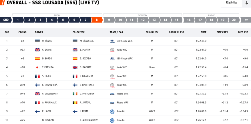 Los estonios habían cedido una decena de segundos con Sébastien Ogier-Julien Ingrassia, encargados de abrir pista. Las sensaciones de la tripulación #8 al finalizar la misma fueron tan negativas que no realizaron declaración alguna en el control stop… pero minutos después se encontrarían en lo más alto de la tabla. Mientras Tänak-Järveoja escalaban sorpresivamente dos plazas, los belgas Thierry Neuville-Martijn Wydaeghe destruyeron sus opciones al triunfo al romper la suspensión trasera derecha de su Hyundai en un impacto con un talud, ocasionado por una nota demasiado optimista, quedando en vano los intentos de reparación en el enlace.