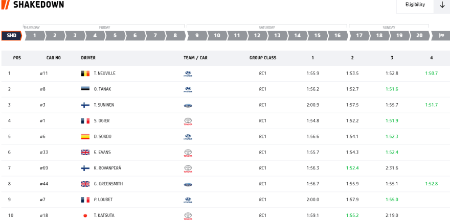 Sin embargo, los cronos que establecieron los vigentes campeones en la primera pasada les alentarán para una etapa a la que parten convencidos de que perderán «muchísimo tiempo». Es por ello que deberán de aprovechar la oportunidad los pupilos de Andrea Adamo y recuperar terreno en la clasificación general del certamen. Las intenciones de Thierry Neuville-Martijn Wydaghe y Ott Tänak-Martin Järveoja, como han evidenciado en este preliminar ‘Shakedown’, son claras. Los belgas se anotaron el mejor registro al establecer un crono de 1:50.7, secundándoles los estonios a 0.9″.