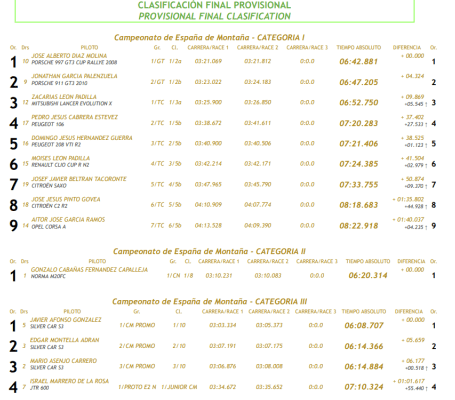En lo que al Campeonato de España se refiere, el local Javier Afonso brilla en su regreso a los mandos del Silver Car S3 que el pasado curso adquirió el grancanario José Luis Rodríguez. A pesar de un periodo de inactividad considerable y de disponer de dos ascensiones menos que los pilotos prioritarios, el de Pegrutrans impuso su ley en las cronometradas oficiales y partirá mañana a la última con una renta en la Categoría III de 5.659” sobre el andorrano Edgar Montellà, también dirigiendo un Silver Car S3.
