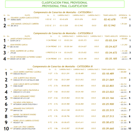 En lo que al regional de montaña concierne, el nuevo rey de la modalidad continúa instaurando plusmarcas por cuarta rampa consecutiva. El ariquero Lauren García encabeza el libro de récords al destronar, a las primeras de cambio, al asturiano Javier Villa, uno de los mayores talentos del continente. Dirigiendo con maestría la Norma M20 FC entre las plataneras del municipio isorano, García estableció un sensacional tiempo de 02:51.076 con el que rebajó el del asturiano en 6″. El palmero afincado en La Gomera, José Manuel González, es segundo de esta Categoría I con su BRC BR53.