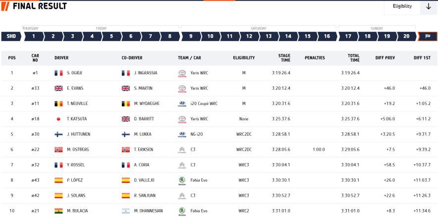 Sus palabras al arranque del fin de semana denotaban cierto grado de frustración ante el viernes que tendrían por delante, en el que aseguraban que perderían «muchísimo tiempo» con la tarea de abrir pista a sus rivales. Sin embargo, los del Toyota Yaris WRC solventaron la etapa inaugural con solvencia y en la tercera posición de la clasificación general. Pero, en las siguientes jornadas de competición, la situación de Sébastien Ogier-Julien Ingrassia mejoraría hasta límites inimaginables.