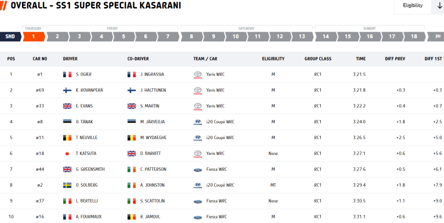 La dupla francesa estableció el registro de referencia en la superespecial de apertura del Rally Safari de Kenia, sexta ronda del Campeonato del Mundo de la especialidad. Sébastien Ogier-Julien Ingrassia dirigen así su Toyota Yaris WRC hacia la primera posición de la clasificación general con una renta de 0.3″ sobre sus compañeros de equipo Kalle Rovanperä-Jonne Halttunen. Los británicos Elfyn Evans-Scott Martin completan el triplete provisional de la estructura comandada por Jari-Matti Latvala.