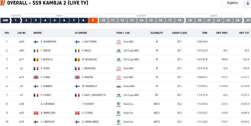 Sin embargo, otro integrante de la formación surcoreana les sucedió en la batalla contra Kalle Rovanperä-Jonne Halttunen. Sin acusar inactividad alguna con el artefacto producido en Alzenau, Craig Breen-Paul Nagle se sobrepusieron a problemas ajenos a su conducción y mantienen el tipo ante la pareja nórdica, de la que les separan 8.5″. A pesar de errar con los reglajes del bucle vespertino, Rovanperä-Halttunen tan solo concedieron un scratch a los irlandeses, completando una jornada sensacional y prometiendo que disponen de un considerable margen de mejora.