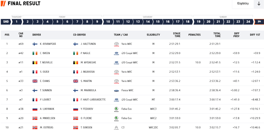 Su inexperiencia en esa posición podría añadirle presión, pero la frialdad característica de los nórdicos convirtió la etapa de hoy, compuesta por seis cronometradas, en un mero trámite para Rovanperä, que aventajó en el término global a los irlandeses Craig Breen-Paul Nagle, sus rivales más próximos, en nada menos que 59.9″, una auténtica barbaridad habida cuenta de las características de los tramos estonios. Además, este resultado impulsa a la firma nipona en el apartado de fabricantes, disfrutando ya de una renta de 59 puntos con respecto a Hyundai.