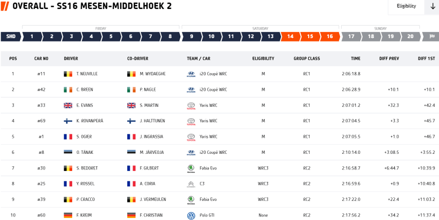Sin embargo, sus compañeros de equipo marchan al frente de la tabla con un colchón de medio minuto sobre los vehículos nipones que les persiguen. Después de construirse la ventaja en las cronometradas del viernes, Andrea Adamo no permitirá a sus pupilos luchar por el triunfo a pesar de separarles escasos 10.1″, primando los puntos para el campeonato de fabricantes. Así las cosas, Thierry Neuville-Martijn Wydaeghe y Craig Breen-Paul Nagle se han dedicado a imprimir un ritmo seguro con el que evitar disgustosas sorpresas en los complejos tramos belgas.