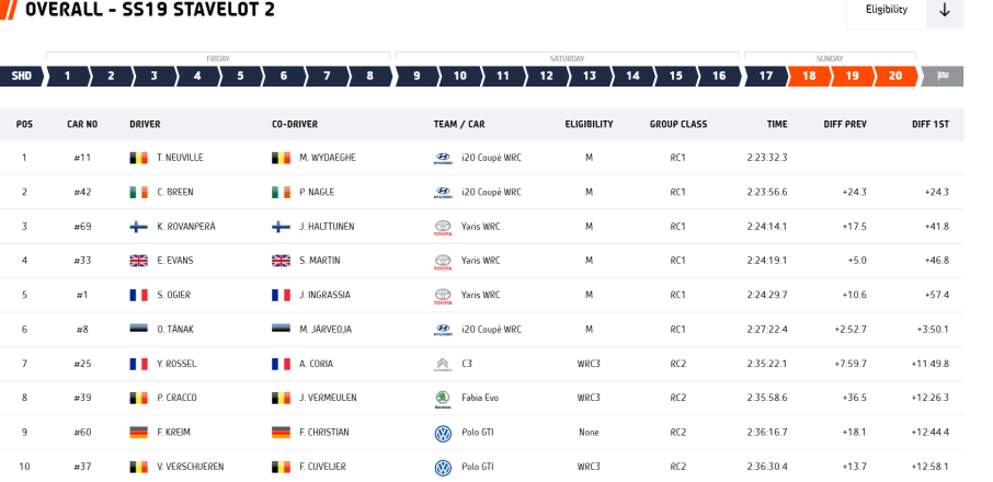 Mientras, Neuville-Wydaeghe empatan en la otra tabla con los británicos Elfyn Evans-Scott Martin, desapercibidos en las especiales dominicales con el Toyota Yaris WRC #33. Un susto que superaron en los kilómetros iniciales de la cronometrada que reanudó las hostilidades en los alrededores del trazado belga disminuyó su confianza hasta el punto de mostrarse absolutamente indefensos ante Kalle Rovanperä-Jonne Halttunen, que se hicieron con el último peldaño del podio.