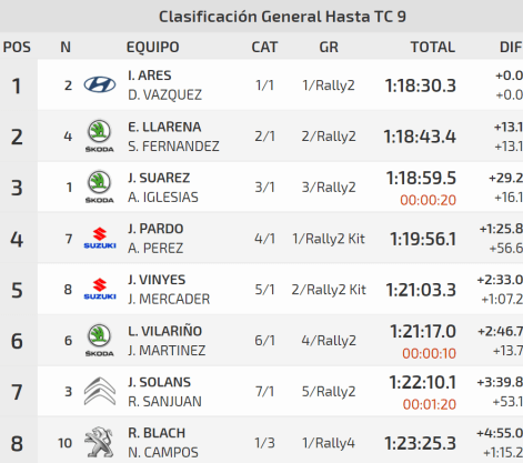 Los líderes del Supercampeonato, José Antonio Suárez-Alberto Iglesias, superaron varios contratiempos mecánicos y salvaron la tercera posición, segunda a efectos del certamen nacional al Llarena-Fernández no bloquear puntos. Los de Recalvi se anotaron cuatro de los cinco scratchs -TC Plus incluido- en disputa en la jornada de hoy, en la que fijaron sus miras en la remontada de Jan Solans-Rodrigo Sanjuán. Los del Citroën C3 Rally2, penalizados con 1:20 por retraso en un control horario, no encontraron la confianza suficiente y se consolaron con un solitario séptimo puesto más dos puntos extra.