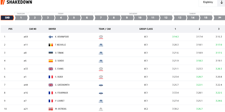 No obstante, con la configuración perfecta arribaron a este Rally Acrópolis los finlandeses Kalle Rovanperä-Jonne Halttunen, autores de una marca estratosférica en su primer tramo en Grecia. Los del Toyota Yaris WRC establecieron un tiempo de 3:14.3 que nadie consiguió inquietar, aventajando la dupla #69 en 2.7″ al siguiente binomio clasificado, el conformado por Thierry Neuville-Martijn Wydaghe (Hyundai i20 Coupé WRC). Sus compañeros en la estructura surcoreana ocuparon las dos siguientes posiciones, con Ott Tänak-Martin Järveoja 0.8″ por delante de Daniel Sordo-Cándido Carrera.