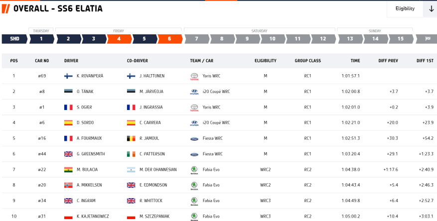 La inexperiencia no cobra factura por el momento a Rovanperä-Halttunen, sorprendidos en algunos momentos por el agarre que ofrecían las pistas griegas cuando en el orden de partida figuraban segundos debido a los problemas de Evans-Martin y Neuville-Wydaeghe. Con una renta de 3.7″ sobre Tänak-Järveoja, los de Toyota defenderán la batuta de mando en unas carreteras, a priori, más embarradas. Los estonios, por su parte, intentarán recuperar las sensaciones de las que han carecido con su montura para rebasar a sus predecesores y contener los ataques de Ogier-Ingrassia.
