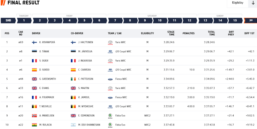 Adrien Fourmaux-Renaud Jamoul no pudieron defenderse debido a un contratiempo en el motor de su vehículo que les obligó a detenerse en el enlace hacia el TC-13, lo que acarreó una penalización de 3′ por retraso en el control horario de salida. Asimismo, un postrero trompo les hizo perder la P6 que ostentaban en favor de Elfyn Evans-Scott Martin (Toyota Yaris WRC). Los belgas Thierry Neuville-Martijn Wydaeghe (Hyundai i20 Coupé WRC) lograron terminar octavos una cita nefasta a sus intereses.
