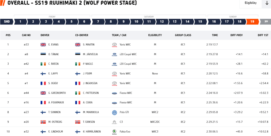 Aprovechando la oportunidad brindada por sus patrocinadores y el apoyo de Toyota Gazoo Racing WRT, los locales Esapekka Lappi-Janne Ferm han finalizado en una notable cuarta posición después de una temporada en la que solamente habían competido a bordo de coches de la categoría R5. Por detrás de los finlandeses concluyeron Ogier-Ingrassia, frustrados con su fin de semana y con un tramo de bonificación en el que el motor de su Toyota no rindió como de costumbre.