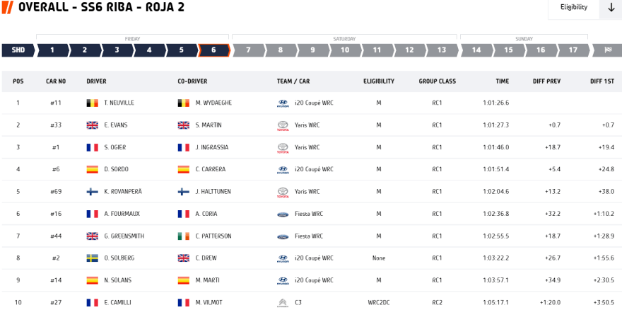 Sin embargo, los que arrancaron el día en lo más alto de la tabla fueron los del Toyota Yaris WRC #33, intratables durante un bucle matinal en el que marcaron diferencias con sus rivales en la lucha por el título, los franceses Sébastien Ogier-Julien Ingrassia. Conscientes de sus reducidas posibilidades a la corona, Evans-Martin se entregaron en cuerpo y alma a la causa, retornando a las carpas de la formación nipona al mediodía con una renta de 7.9″ sobre Neuville-Wydaeghe.