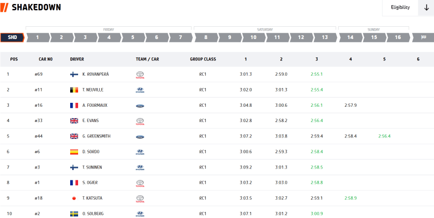 A pesar de encontrarse envuelto en la lucha por el entorchado junto a un Julien Ingrassia que se retira de la competición, Ogier escondió sus cartas en el ‘Shakedown’ concluyendo en una discreta P8 a 3.7″ del mejor registro, realizado por sus compañeros de equipo Kalle Rovanperä-Jonne Halttunen. Los finlandeses establecieron una marca de 2:55.1 en la tercera manga, endosando 0.3″ al siguiente equipo clasificado, el conformado por los belgas Thierry Neuville-Martijn Wydaeghe (Hyundai i20 Coupé WRC).