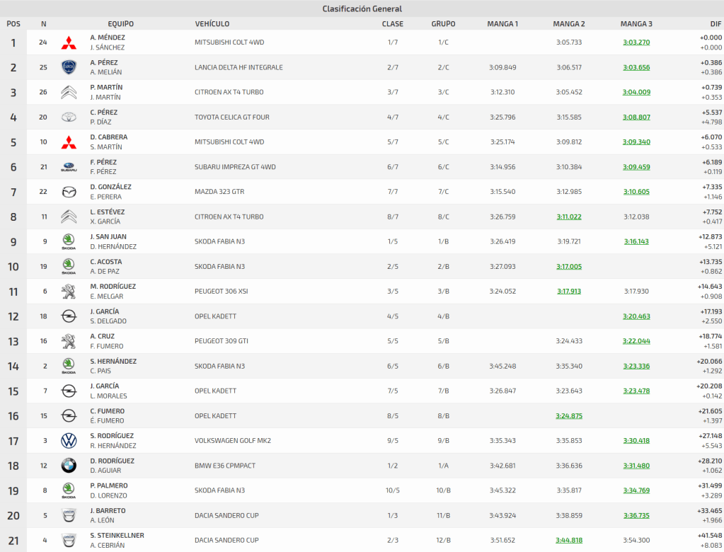 Daniel González-Eliana Perera concluyeron séptimos con su Mazda 323 GTR, justo por delante de Luis Alberto Estévez-Yeray García y su Citroën AX T4 Turbo. En la Agrupación B, reservada a los vehículos de tracción delantera, se impusieron José Gregorio Sanjuán-David Hernández a los mandos de un Skoda Fabia 1.2 TSI N3. Los integrantes del equipo EDAL Competición, además de adueñarse del noveno lugar de la clasificación general, lograron superar a la idéntica montura de Carlos Acosta-Alberto de Paz.