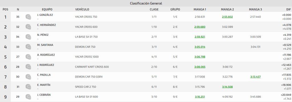 En el apartado de Car-Cross, la disputa por el entorchado insular se resolvió en favor de José Manuel González. El piloto del Yacar Cross 750 no otorgó la menor opción a la competencia y supo reponerse del abandono de Barlovento. Nelson Pérez iniciaba el 4º Slalom ADEA – Trofeo Femarpal al frente de la tabla de puntos, pero su presencia en el tercer peldaño del cuadro de honor resultó insuficiente para evitar la remontada del tinerfeño. Carlos Hernández, segundo, separó a los aspirantes a la corona.