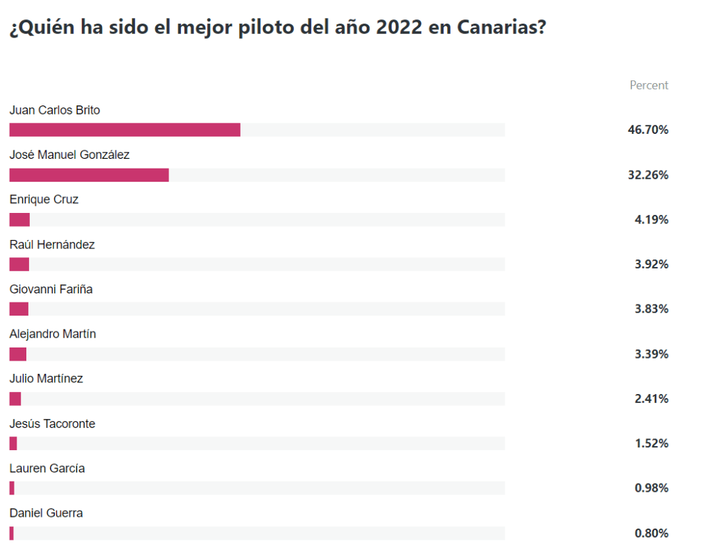 La votación por el mejor piloto de la campaña 2022 en Canarias, organizada por RMRacingMode.com, termina con Juan Carlos Brito en la primera posición. El hombre de Evolución Car recibió el 46.70% de los votos después de impresionar en su temporada de debut a bordo del Ford Fiesta R5+. Justo por detrás del tinerfeño, a 14.44 puntos de distancia, finalizó José Manuel González, mientras que Enrique Cruz fue el tercero más apoyado por los más de once centenares de aficionados que participaron.