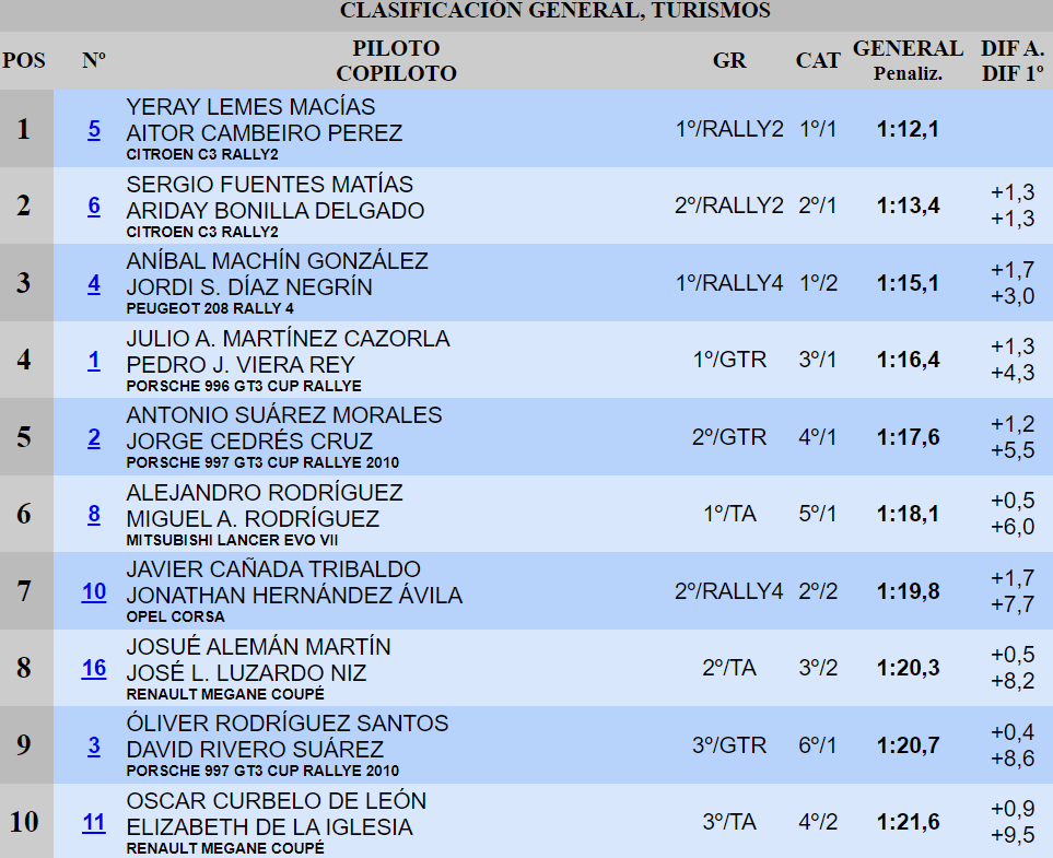 El octavo lugar está en posesión del Renault Megane Coupé de Josué Alemán y José Luzardo, mientras que en el noveno figuran Óliver Rodríguez y David Rivero. Los del Porsche 997 GT3 Cup Rallye 2010 sufrieron con problemas de subviraje en las zonas menos limpias del recorrido. Mañana tendrán que hacer frente a un déficit de cerca de nueve segundos con respecto a Lemes y Cambeiro. Óscar Curbelo y Elizabeth de la Iglesia, compartiendo el habitáculo de un Renault Megane Coupé, duermen décimos.