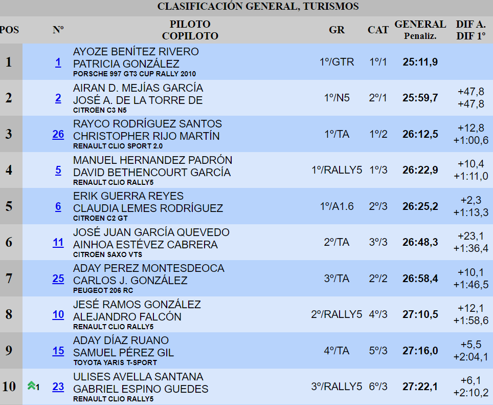 La dupla del Porsche 997 GT3 Cup Rallye 2010 inscribe su nombre en el historial de ganadores del RallySprint Ciudad de Arucas. Los grancanarios dominan de principio a fin y terminan la cita valedera para el Campeonato Provincial de Las Palmas de la disciplina con una renta de casi cincuenta segundos sobre los siguientes clasificados. Los tinerfeños Airán Mejías y José Agustín de la Torre saldan su visita a la isla oriental con una segunda plaza. Los del Citroën C3 N5 consiguen superar a Rayco Rodríguez y Christopher Rijo en el penúltimo tramo. Los conejeros del Renault Clio Sport, la sensación del fin de semana.