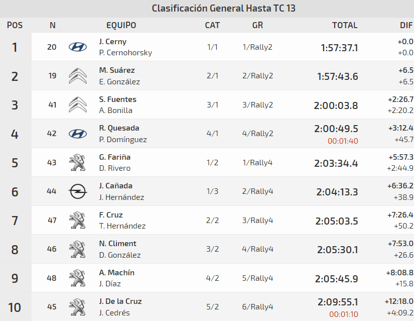 El tinerfeño Sergio Fuentes, con el lanzaroteño Ariday Bonilla a las notas, repitió presencia en el cuadro de honor a los mandos del Citroën C3 Rally2. Avanzando en la adaptación al artefacto francés, el de Candelaria ya cuenta en su casillero con un número de puntos importante. Los grancanarios Raúl Quesada-Pedro Domínguez fueron lastrados por una avería en la servodirección y un posterior toque con el Hyundai i20 R5. Estos percances les hicieron penalizar en un control horario y descender a P4.