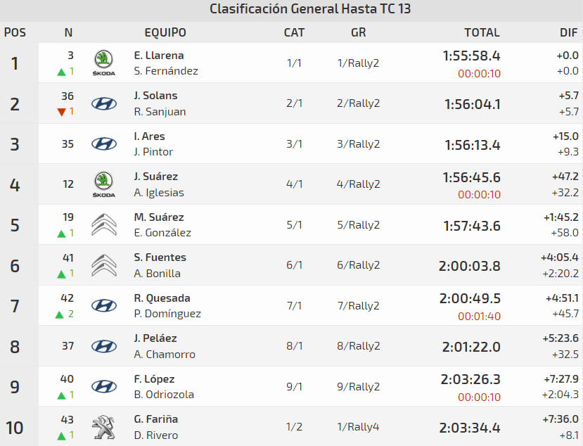 Los canarios Miguel Suárez-Eduardo González (Citroën C3 Rally2) aprovecharon el postrero accidente de Óscar Palomo-Rodolfo del Barrio (Hyundai i20 N Rally2) para subir al quinto puesto. Dos seguidores más del ‘Mundialito Canario’, Sergio Fuentes-Ariday Bonilla (Citroën C3 Rally2) y Raúl Quesada-Pedro Domínguez (Hyundai i20 R5), cerraron el top siete. Los Hyundai i20 N Rally2 de José Luis Peláez-Alberto Chamorro y Francisco López-Borja Odriozola alcanzaron la meta final en P8 y P9, respectivamente.