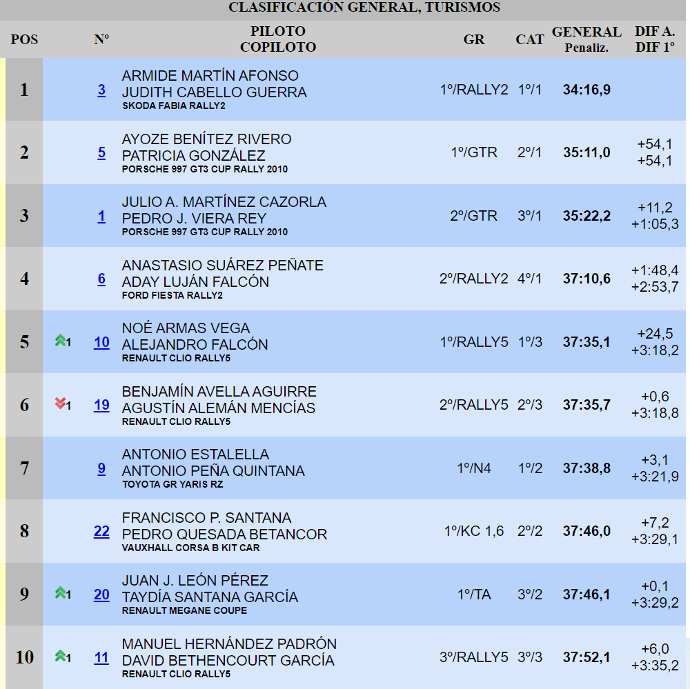 Benjamín Avella y Agustín Alemán, equipando ruedas nuevas en el tren delantero de su Renault, no sienten el confort óptimo. Los de Escudería Maspalomas ceden seis décimas con sus predecesores. El séptimo lugar absoluto lo ocupan Antonio Estalella y Antonio Peña con su Toyota GR Yaris RZ, mientras el top diez lo cierran Francisco Pablo Santana-Pedro Quesada (Vauxhall Corsa B Kit-Car), Juan José León-Taydía Santana (Renault Megane Coupé) y Manuel Hernández-David Bethencourt (Renault Clio Rally5).