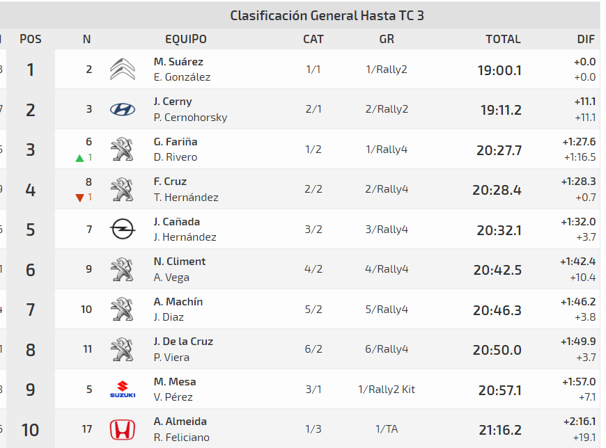 Fernando Cruz y Tecorice Hernández figuran cuartos a bordo de otro Peugeot 208 Rally4, justo un lugar por delante del Opel Corsa Rally4 de Javier Cañada y Jonathan Hernández. Más duplas integradas en el certamen de Sports&You Canarias ruedan en P6, P7 y P8, siendo estas las conformadas por Nelson Climent-Agustín Vega, Aníbal Machín-Jordi Díaz y Juan Carlos de la Cruz-Pedro Viera, respectivamente. Un toque en el TC1 lastra a Manuel Mesa y Víctor Pérez, novenos con el Suzuki Swift R4LLY S Rally2-Kit.