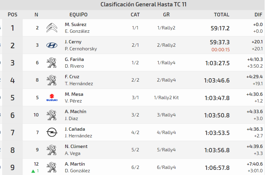 Los vigentes campeones del autonómico, Enrique Cruz y Yeray Mujica, cerraron su aciago fin de semana con cuatro victorias parciales a su nombre. Los del Ford Fiesta Rally2, que habían marcado el segundo mejor tiempo en el TC Plus, rescatan unos pocos puntos con los que mantienen viva la esperanza por renovar su entorchado. Los pupilos de Fernando Capdevila afrontaron la jornada como un día de test. Así, emplearon diferentes configuraciones con la vista puesta en el inminente 32º Rallye Villa de Adeje.