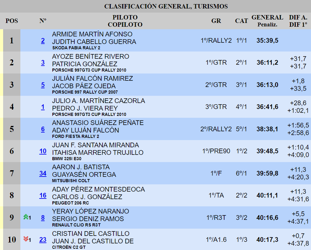 Los líderes del Campeonato Provincial de Las Palmas de Rallyes sobre Asfalto, Julio Martínez y Pedro Viera, ocupan un solitario cuarto puesto con su Porsche 997 GT3 Cup Rallye 2010. Aunque registraron una progresión notable con respecto a la sección matinal, aún carecen de la velocidad para establecer unas marcas similares a las de los vehículos alemanes que tienen por delante. Anastasio Suárez y Aday Luján, plenamente concentrados en asegurar su lugar, cierran el top cinco a bordo del Ford Fiesta R5.