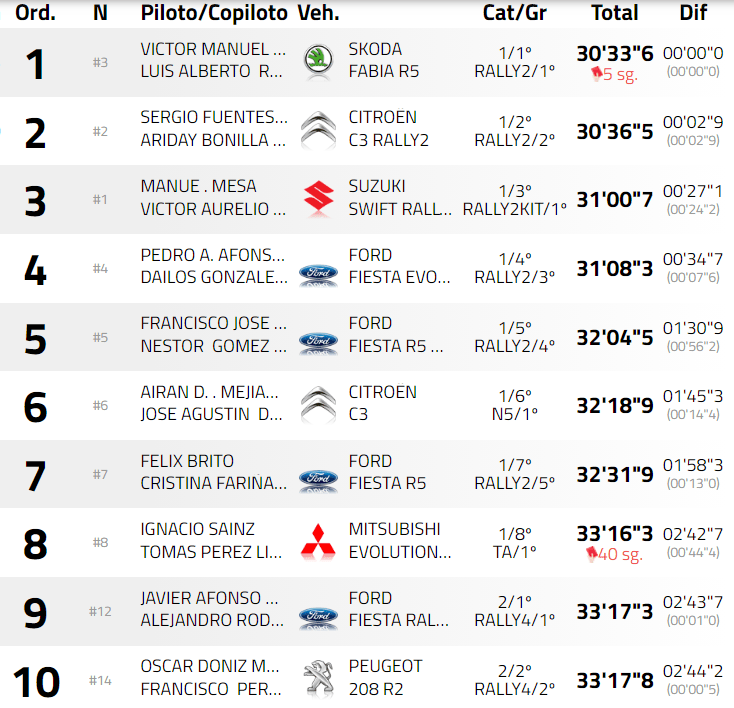 El último cajón del podio provisional continúa en posesión de Manuel Mesa y Víctor Pérez. Los hombres del Suzuki Swift R4LLY S Rally2-Kit, tomando «demasiados riesgos» en su misión por defender la tercera plaza en la que se instalaron desde el inicio, cortan las alas a Pedro Javier Afonso y Dailos González. Los del Ford Fiesta R5 Evo2 apenas lograron derrotarles en una cronometrada… y por apenas tres décimas. Lo perdido en cada visita a ‘El Boquerón-Valle de Guerra’ les está lastrando de forma muy considerable.