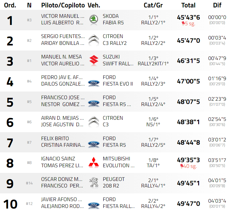 Francisco Suárez y Néstor Gómez terminaron quintos a bordo del Ford Fiesta Rally2. Los integrantes del equipo ASB Competición también sufrieron en ciertas zonas del itinerario, rodando la mayor parte de la jornada en solitario. La sexta plaza recayó en las manos de Airán Mejías y José Agustín de la Torre, que salvaron los muebles en un TC9 que realizaron sin el apoyo del embrague del Citroën C3 N5. Félix Brito y Cristina Fariña, séptimos, carecieron de margen para aprovechar ese problema con su Ford Fiesta R5.