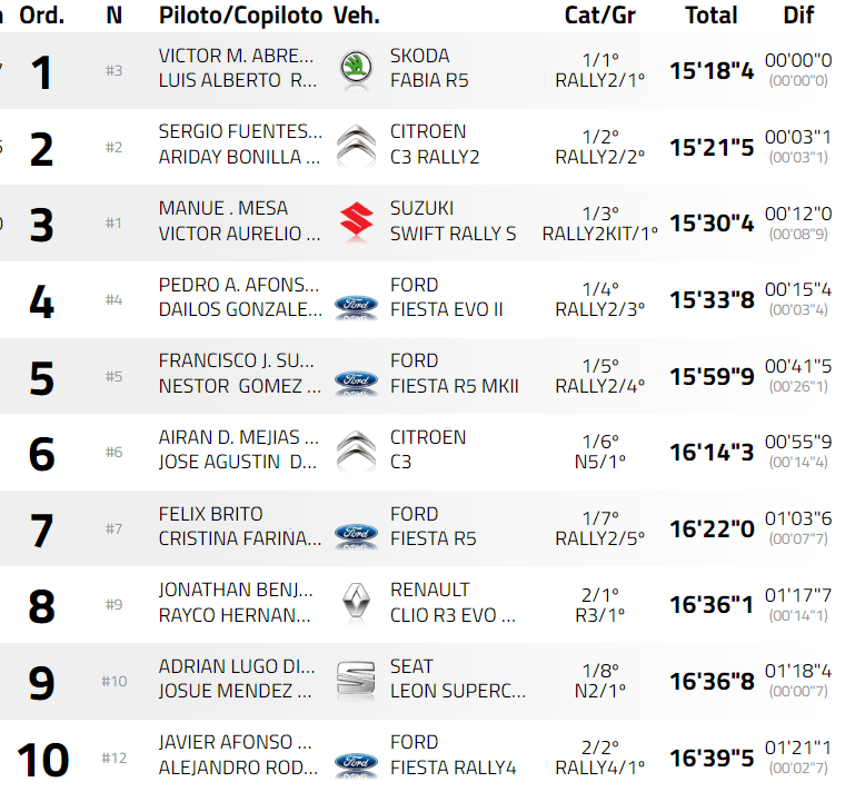 Félix Brito y Cristina Fariña ruedan séptimos con el Ford Fiesta R5. El octavo puesto lo ocupa la pareja más rápida en el apartado 2 Ruedas Motrices, la formada por Jonathan Morales y Tecorice Hernández. Los del Renault Clio R3 Evo Max se repusieron a un trompo en el TC1 y superan por solo siete décimas al Seat León Supercopa MK2 que comparten Adrián Lugo y Josué Méndez. El top diez lo cierran Javier Afonso y Alejandro Rodríguez con una de las unidades Ford Fiesta Rally4 inscritas por DISA Copi Sport.
