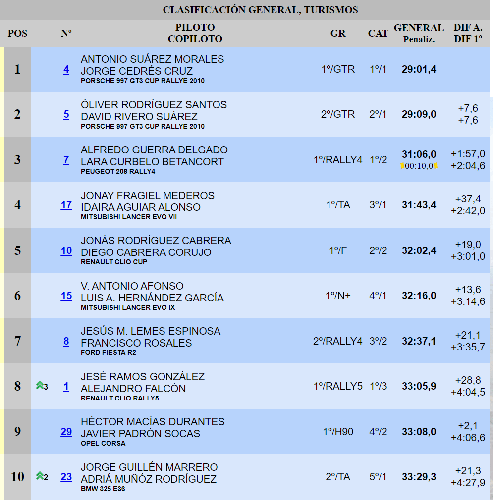 El del Porsche 997 GT3 Cup Rallye 2010 y Jorge Cedrés consiguen su primera victoria del curso en una prueba marcada por la inestabilidad meteorológica. Gestionan la renta obtenida en las especiales de la noche del viernes durante un sábado en el que lidian con un contratiempo en el tren trasero del artefacto germano. La lluvia no afecta al desarrollo de la segunda jornada de competición en el municipio del sur de Lanzarote. Óliver Rodríguez y David Rivero aseguran la plata después de incomodar a sus predecesores con una sucesión de mejores registros. Alfredo Guerra y Lara Curbelo completan el cuadro de honor.