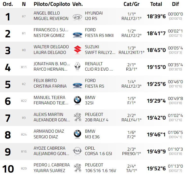 El piloto del Hyundai i20 R5 logra una victoria trabajada en la prueba valedera para el Campeonato de Canarias de la especialidad. Las diferencias con Francisco Suárez y Walter Delgado no superan la frontera de los tres segundos en ninguna de las cinco mangas celebradas. La igualdad reinante en la catedral del automovilismo tinerfeño mantiene a los aficionados en tensión hasta el tramo final. El de San Miguel de Abona, acompañado por Miguel Reverón, termina precediendo por apenas 2.1″ al integrante del equipo ASB Competición. El del Suzuki Swift R4LLY S Rally2-Kit concluye tercero a solo 5.4″ del ganador.